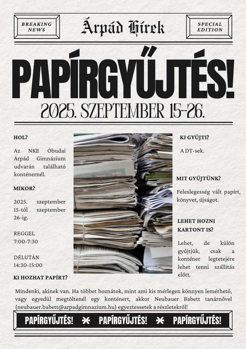 A felvételi eljárási rendről és az NKE Óbudai Árpád Gimnáziumról 2025. november 10-én (hétfőn) 16 órától online felvételi tájékoztatót tartunk, melyre minden, iskolánk iránt érdeklődő hatodikos és nyolcadikos diákot és szüleit szeretettel várunk. A tájékoztatót a https://www.youtube.com/live/tKA6pM_D5qo linken lehet visszanézni. A tájékoztatón vetített prezentáció a tájékoztató innen letölthető. tovább olvasom »