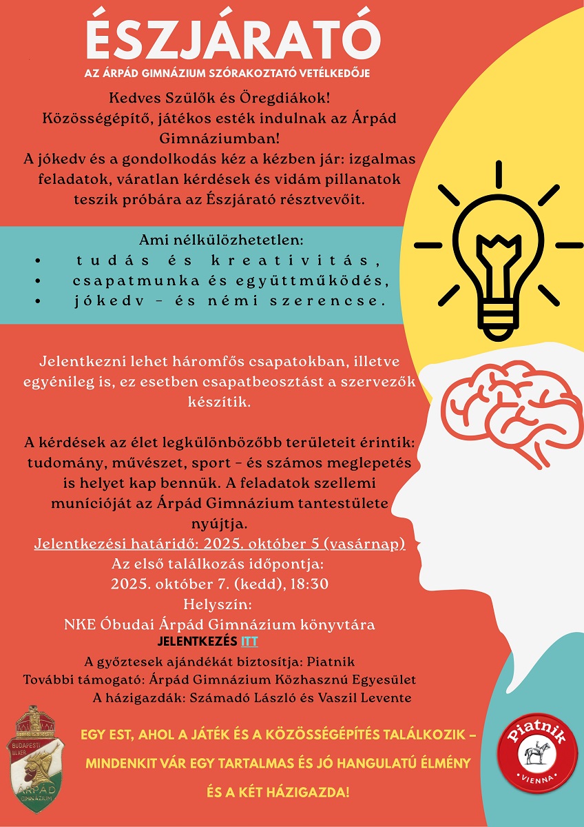 A kérdések az élet legkülönbözőbb területeit érintik: tudomány, művészet, sport – és számos meglepetés is helyet kap bennük. A feladatok szellemi munícióját az Árpád Gimnázium tantestülete biztosítja.