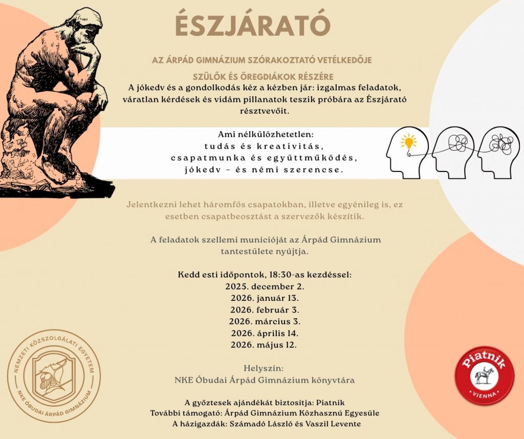 A kérdések az élet legkülönbözőbb területeit érintik: tudomány, művészet, sport – és számos meglepetés is helyet kap bennük. A feladatok szellemi munícióját az Árpád Gimnázium tantestülete biztosítja.