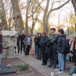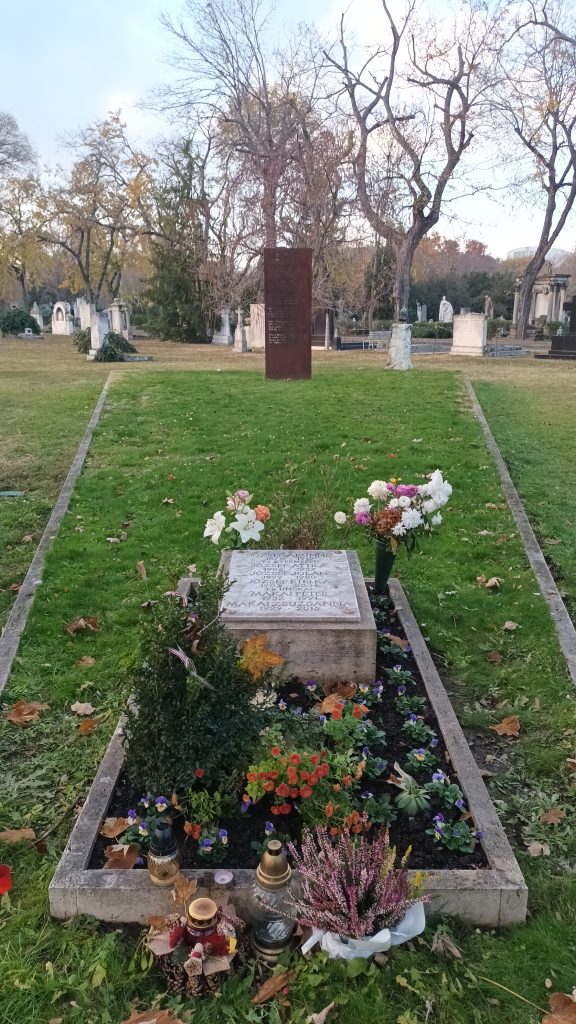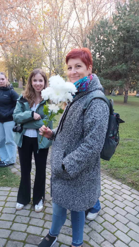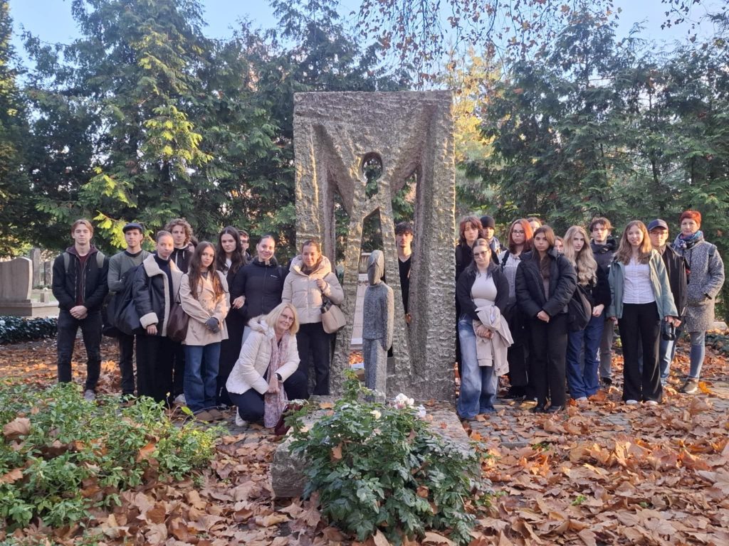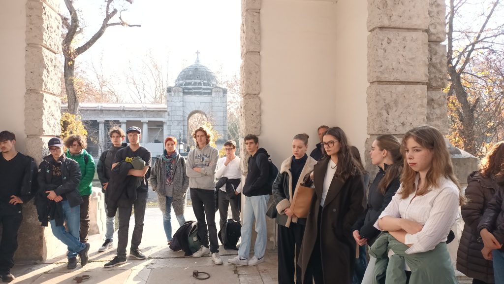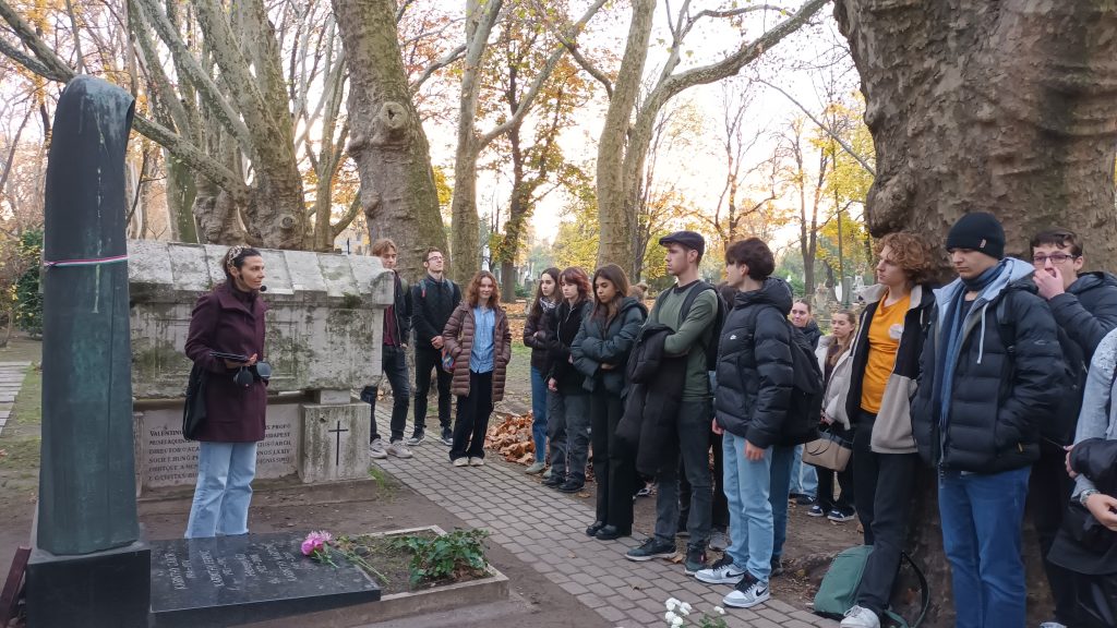 Napsütéses novemberi délutánon a 12.a osztály Fülöp Katalin tanárnő szervezésében és Szalay Katalin osztályfőnök kíséretében a Nyugat c. folyóirathoz kapcsolódó költők, írók sírját látogatta meg a Fiumei úti nemzeti sírkertben. A séta a Csorba Géza által készített Ady-síremléknél kezdődött, ahol megtudtuk, hogy a robosztus szobor a Góg és Magóg fia vagyok én… lírikusát ábrázolja és nem a már beteg költőt idézi. Még mielőtt Babits, Móricz és Szabó Lőrinc sírjához értünk volna, egy pillanatra megálltunk Baumgarten Ferenc mecénás emlékművénél is, aki végrendelete szerint halála után teljes vagyonát “a szűkölködő magyar írók anyagi gondjainak enyhítésére” fordítja majd. Az alapítvány gondozását Babits Mihályra bízta. A séta alatt sok érdekesség elhangzott, így például, hogyan játszotta át Tanner Ilonát Babitsnak Szabó Lőrinc, milyen ugratásokkal szórakoztatta egymást Karinthy és Kosztolányi, milyen motívumok láthatók Móricz sírján. A Karinthy-család emlékművénél Karinthy Frigyes egyik versét hallgattuk meg, majd Kosztolányi diákévei elevenedtek meg egy-két anekdotában az Ősze András által készített szoborkompozíció előtt. Felkerestük a 81 éve elhunyt Radnóti Miklós és felesége, Gyarmati Fanni sírját is, ahol belehallgattunk a Tétova ódába. Ezután megálltunk a tragikus sorsú József Attilánál, akinek síremléke egy fordított A betűt formáz, és együttesen jelenik meg rajta a Tiszta szívvel és az Íme, hát megleltem hazámat c. költemény. Sétánkat Léda sírjánál fejeztük be, aki egyszerre volt teremtője és részese az Ady-mítosznak.